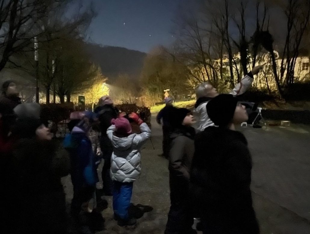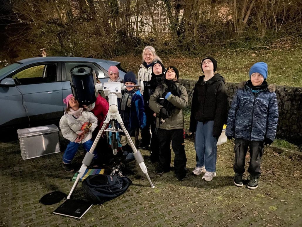 Am Abend des 10. Januar, in einer sehr klaren Nacht, trafen sich die 1. Beobachtungsgruppe der Astro-AG mit Frau Thiering, Frau Brück und einigen Eltern, um mithilfe unseres Schulteleskops und Feldstechern den Himmel zu betrachten. Da es 3 Tage vor Vollmond war, handelte es sich um eine relativ helle Nacht, was aber nicht störte, da es in dieser Nacht sehr viele helle Planeten zu sehen gab und wir außerdem unseren Schwerpunkt statt auf die schwachen „deep sky“ Galaxien und Gasnebel einfach auf die Mondbeobachtung legten. Man konnte mit dem Teleskop und seiner elektrischen Nachführung über die Mondlandschaft ’spazieren fahren‘ und sowohl die strahlenförmig, von der Einschlagkratern wegzeigenden Materieauswürfe verfolgen, als auch die zentralen Berge in den größeren Kraterbecken bewundern. Die Kinder waren engagiert dabei, stellten viele Fragen und gaben interessiertes feedback: