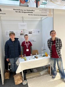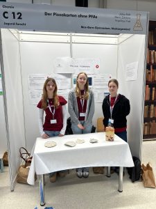 Pizza unterwegs, lecker! Leider essen wir aber nicht nur die leckere Pizza, sondern die giftigen Ewigkeitschemikalien (PFAs) im Pizzakartons gleich mit. Daher haben Julika Roth (10a), Angelique Fast(10d) und Maria Zatykina (10a) einen PFA freien Pizzakarton entwickelt und mit diesem im Fachbereich Chemie den zweiten Preis gewonnen.