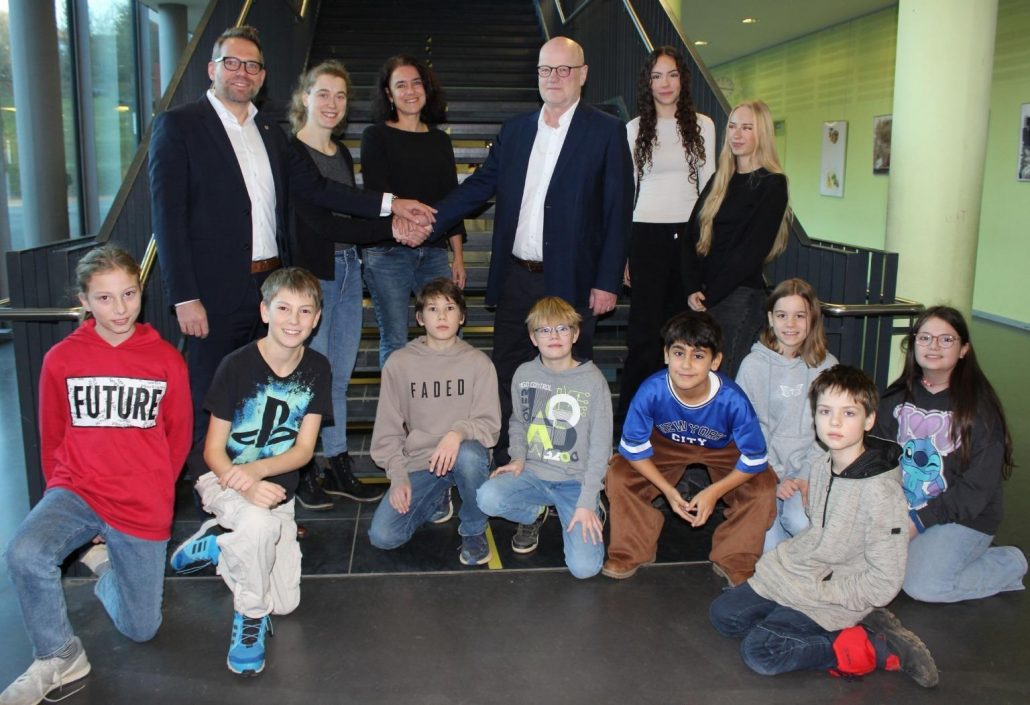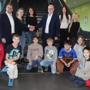 Dass der Weih­nachts­ba­sar erneut eine solch beacht­li­che Sum­me erzie­len konn­te, ist den Ideen und der Tat­kraft der gesam­ten Schul­ge­mein­schaft zu ver­dan­ken. Bei der Spen­den­über­ga­be waren die­je­ni­gen anwe­send, die beson­ders zum Gelin­gen des Basars bei­tru­gen: Leh­re­rin Eve­lyn Sta­edel, die mit Unter­stüt­zung der Refe­ren­da­re die Orga­ni­sa­ti­on über­nahm, sowie Kiara Engel­hart und Lil­ly Hobeck von der Schü­ler­mit­ver­wal­tung, die den SMV-Stand für El Moli­no betreu­te. Das Enga­ge­ment der Unter­stu­fe reprä­sen­tier­ten Oli­ver Wei­chert und Eli­as Pfau, ergänzt durch wei­te­re Schü­ler. Schul­lei­ter Joa­chim Phil­ipp bedank­te sich bei allen Betei­lig­ten für ihren Ein­satz und auch Lions Club Prä­si­dent Manu­el Men­ke sprach sei­ne Aner­ken­nung für die Schu­le aus. .
