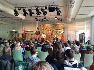 Robin Hood und sei­ne Mer­ry Men sowie Mari­an und der Metz­ger Gil­bert füh­ren den She­riff immer wie­der an der Nase her­um. Die Fünft- und Sechst­kläss­ler durf­ten hier­bei kräf­tig mit­wir­ken: Die Rol­len des Bisch­offs und der Mer­ry Men wur­den bei­spiels­wei­se von Schü­le­rin­nen und Schü­lern über­nom­men. Außer­dem durf­ten sie Sze­nen­ge­räu­sche machen und beim Ver­steck­spiel mit­hel­fen. Laut­hals und mit viel Spaß wirk­ten die Schüler*innen dabei mit, dass Robin Hood immer wie­der dem She­riff ent­kom­men konn­te.