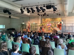 In zwei Auf­füh­run­gen begeis­ter­ten die jun­gen Schauspieler*innen Sophie und Will aus Eng­land, Came­ron aus Wales und Car­ly aus den USA die Schü­le­rin­nen und Schü­ler mit einem inter­ak­ti­ven Stück über Maid Mari­an, die Ver­lob­te des berühmt berüch­tig­ten Robin Hood aus Sher­wood Forest. In einem lus­ti­gen Ver­steck- und Ver­fol­gungs­spiel siegt das Gute über das Böse und die Lie­ben­den wer­den schließ­lich von König Richard I. höchst­per­sön­lich ver­mählt. Dies geschieht erst, nach­dem der Wider­sa­cher, der gie­ri­ge She­riff von Not­ting­ham, der die rei­che und ade­li­ge Mari­an eigent­lich selbst hei­ra­ten möch­te und es des­halb auf Robin Hoods Leben abge­se­hen hat, vom König zu einem armen Bett­ler degra­diert wird.