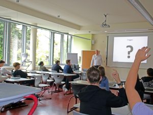 Ein Schüler wollte wissen, wie Dr. Schütte vorgeht, wenn er nicht die gleiche Meinung wie seine Partei, die CDU, habe. Schütte erklärte, dass es nicht immer möglich sei, einer Meinung zu sein. „Häufig kann ein gemeinsamer Dialog entstehen, der zu einem guten Kompromiss beitragen kann.“ Allerdings stimme er in wenigen Fällen auch sichtbar anders ab, als seine Fraktion. Für ihn sei es die Grundlage seines Amtes, sich frei entscheiden zu können. „Es ist ein großer Mehrwert, wenn die Politiker einen soliden beruflichen Hintergrund haben und ein breites Spektrum an Wissen und Erfahrungen mitbringen.“