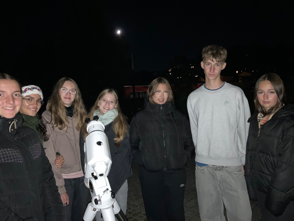 Am 1. Oktober 2025 war die erste Beobachtungsgruppe der Kl. 9 aus dem Fach NWT mit Fr. Thiering auf dem Lehrerparkplatz an der Schule, um den Nachthimmel zu beobachten und besser kennenzulernen. Der Treffpunkt war um 20.30 Uhr und die gemeinsame Veranstaltung ging bis 22.00 Uhr.