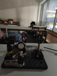 Von 12:00-13:00 Uhr gab es dann für alle das Mit­tag­essen in Form von beleg­ten Bröt­chen, Tee, Kaf­fee, Säf­ten und Bre­zeln. In der Zeit konn­te man sich mit sei­nen Freun­den über die ver­schie­de­nen Work­shops aus­tau­schen. Danach ging es mit dem zwei­ten Work­shop-Blö­cken wei­ter. In mei­nem Work­shop arbei­te­ten wir mit einem Laser-Inter­fe­ro­me­ter (s.Abb.) mit dem wird inter­es­san­te Inter­fe­renz­mus­ter erzeug­ten (s.Abb.).