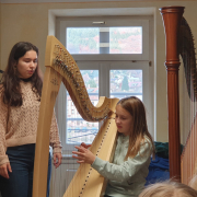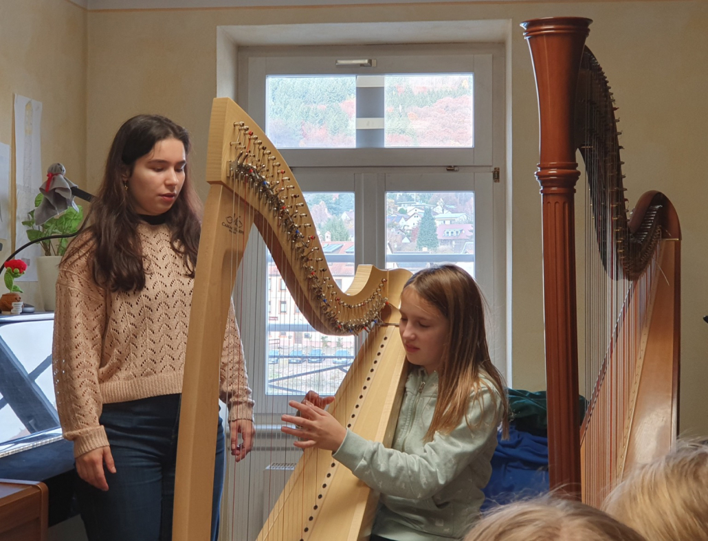 Ob die Schlag­wer­ke oder die Har­fe (sie­he Fotos) das inter­es­san­tes­te Instru­met waren, bleibt offen. Jeder der Musik­ex­per­ten hat ab Febru­ar die Mög­lich­keit in einem Pro­be­abo an der Musik­schu­le ein Instru­ment ver­tie­fend zu erler­nen.