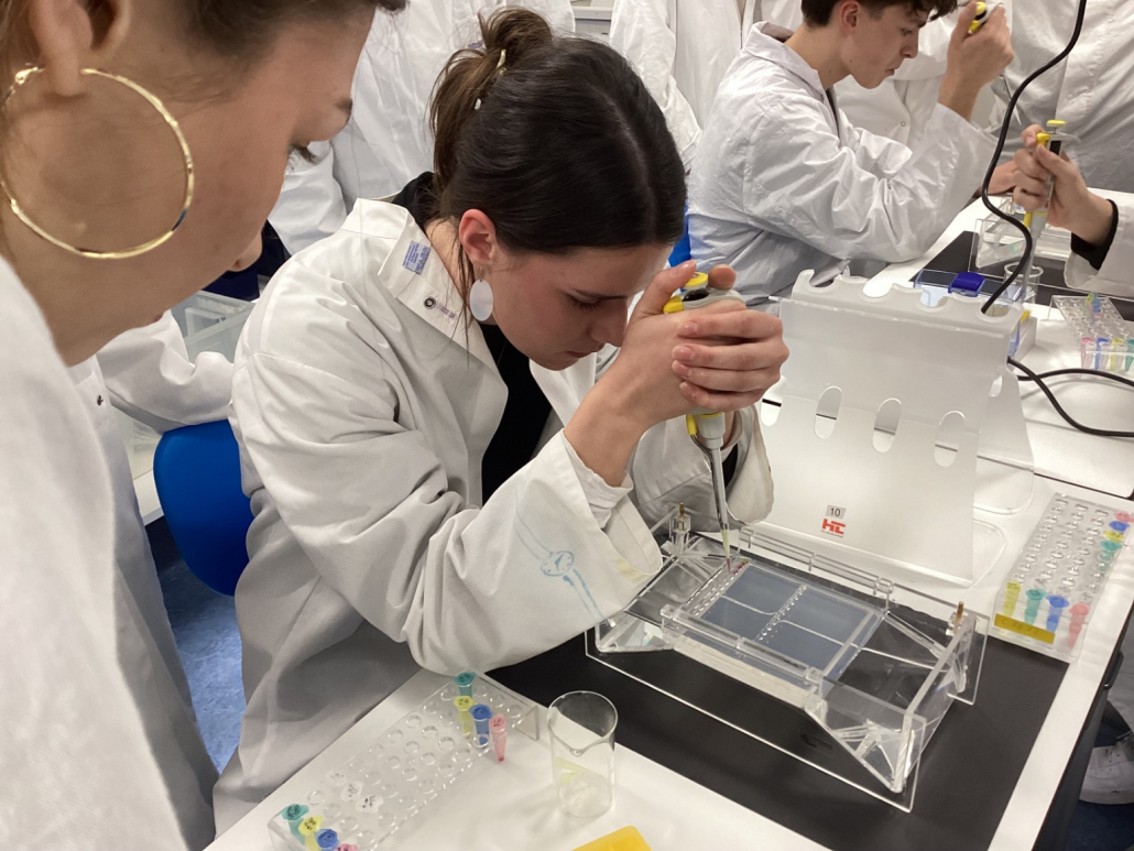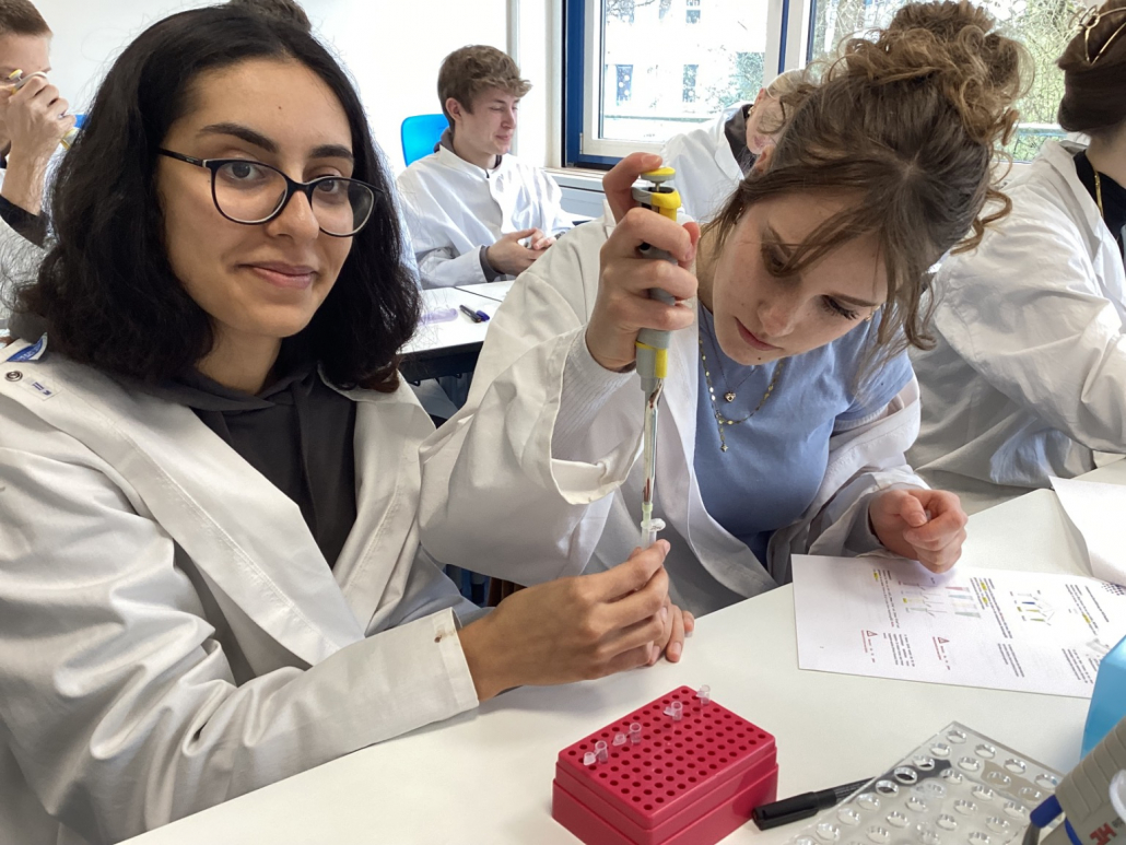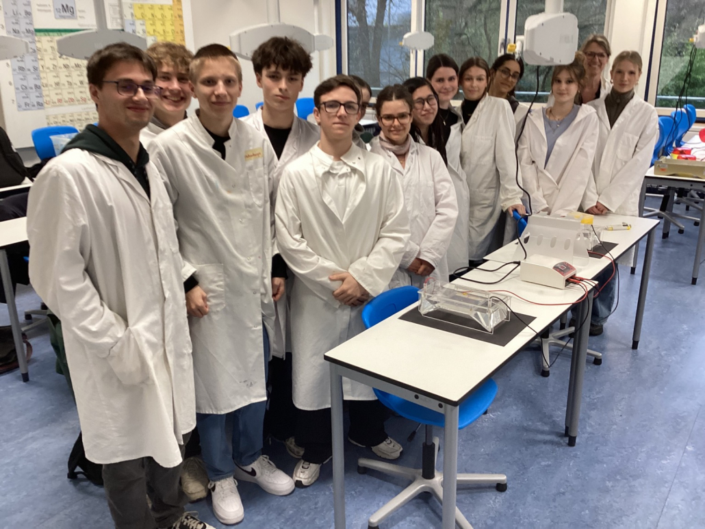 Am 25. März unternahm der Biologie-Leistungskurs von Frau Winter eine Exkursion zur Stützpunktschule für Molekulargenetik in Bammental. Die Veranstaltung begann um 14:00 Uhr und wir wurden zunächst herzlich von der Lehrerin Frau Hartmann sowie zwei Schülern aus der Kursstufe vor Ort begrüßt. Zu Beginn erhielten wir Laborkittel und eine Einführung in die Aufgabenstellung des Nachmittags. Thematisch beschäftigten wir uns mit der genetischen autosomal-dominanten Krankheit Chorea Huntington. Ziel war es, mithilfe künstlich hergestellter DNA eine Polymerase-Kettenreaktion (PCR) durchzuführen und die Ergebnisse anschließend mithilfe der Gel-Elektrophorese auszuwerten. Im praktischen Teil stellten wir dazu zunächst für vier Proben (Vater, Mutter, Kind 1 und Kind 2) jeweils die PCR-Ansätze her. Dazu pipettierten wir mit Mikropipetten den PCR-Mix, zwei Primer (Start- und Endsequenz) sowie die jeweilige DNA-Probe in kleine Reaktionsgefäße. Diese wurden anschließend in den Thermocycler gegeben, der die PCR automatisiert durchführt. Während der etwa 40-minütigen Laufzeit der PCR vertieften wir unser theoretisches Wissen, indem wir die Funktionsweise der PCR sowie weitere molekulargenetische Methoden besprachen. Außerdem setzten wir uns mit ethischen Fragestellungen auseinander, insbesondere damit, wie man verantwortungsvoll mit genetischen Untersuchungsergebnissen umgeht. Zwischendurch gab es eine kurze Pause. Nach Abschluss der PCR versetzten wir die Proben mit einem Ladepuffer und führten die Gel-Elektrophorese durch. Während das Gel lief, bearbeiteten wir begleitende Aufgaben zur Auswertung. Abschließend konnten wir die Ergebnisse unter UV-Licht sichtbar machen und interpretieren und pünktlich um 17:15 war das Praktikum damit beendet. Die Exkursion hat uns viel Spaß gemacht und bot vor allem die Möglichkeit, theoretisches Wissen praktisch anzuwenden. Besonders die eigenständige Durchführung der Experimente war eine wertvolle Erfahrung. Insgesamt hat uns diese Auffrischung der Genetik sehr beim Verständnis der Inhalte geholfen und stellt eine gute Vorbereitung auf das Abitur dar.