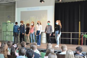 Felix Hornek und Marie Hambrecht aus der SMV dankten den Schülerinnen und Schülern, die in vielen Aktionen Geld für die Ukraine gesammelt hatten, sodass über 5000€ zusammengekommen waren.